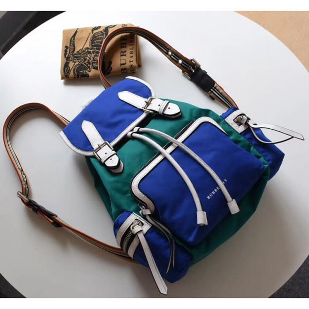 / Burberry Medium Rucksace in Colour Block Nylon and Leather Blue/Green 2018 Collection