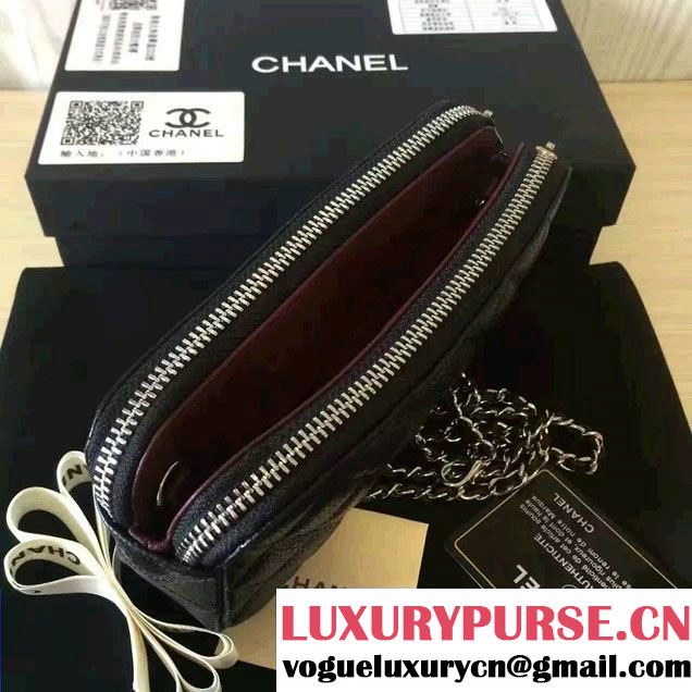 / Chanel Double Zipped Small Clutch Chian Bag A82527 Grained Calfskin Black/Silver 2016