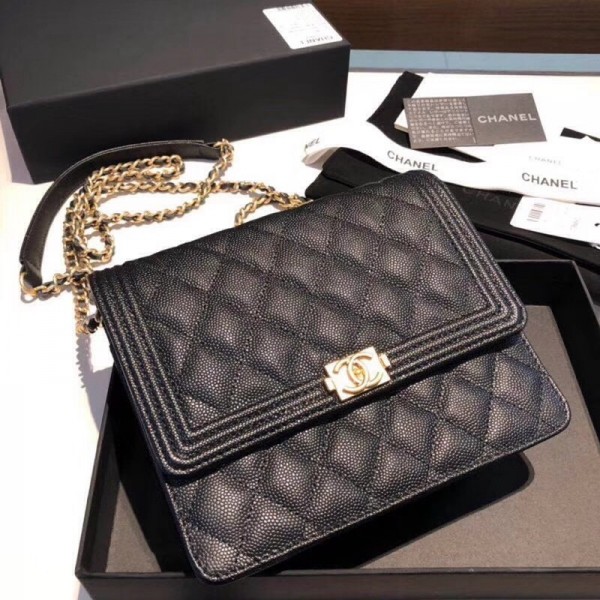 / Chanel Grained Calfskin Boy Square Wallet on Chain WOC Black 2018 Collection