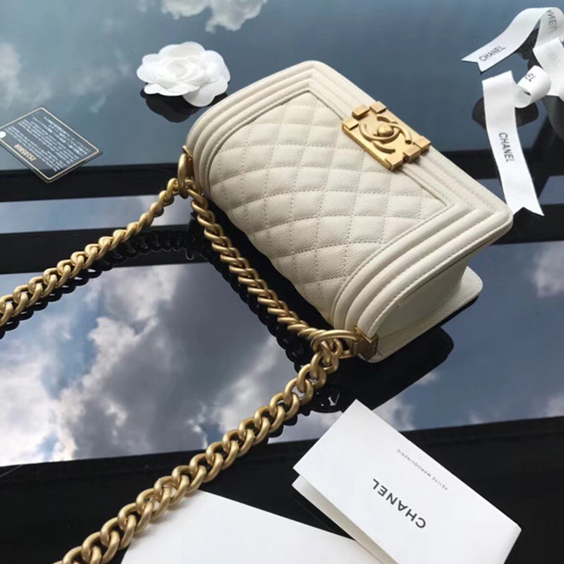 / Chanel Small Le Boy Flap Bag Beige Grained Calfskin Gold-Tone Metal