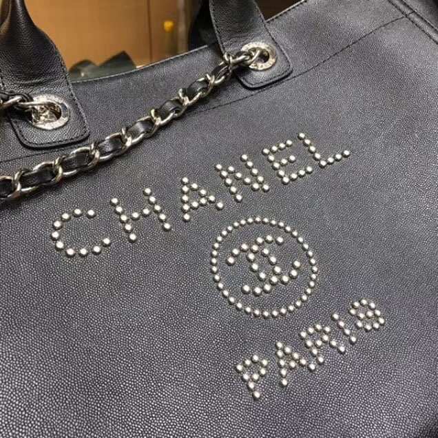 Chanel Studded Grained Calfskin Deauville Medium Shopping Bag A57067 Black 2018