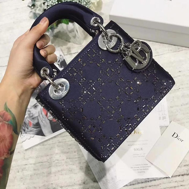 Christian Dior Satin Lady Dior Bag with Beads 17cm Silver Hardware Fall Winter 2017 Collection Dark Blue