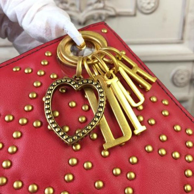 Christian Dior Supple Lady Dior Studded Tote Mini Bag with Wide Studded Strap 17cm Aged Gold Hardware Cannage Quilted Lambskin Leather Spring/Summer 2018 Collection, Red