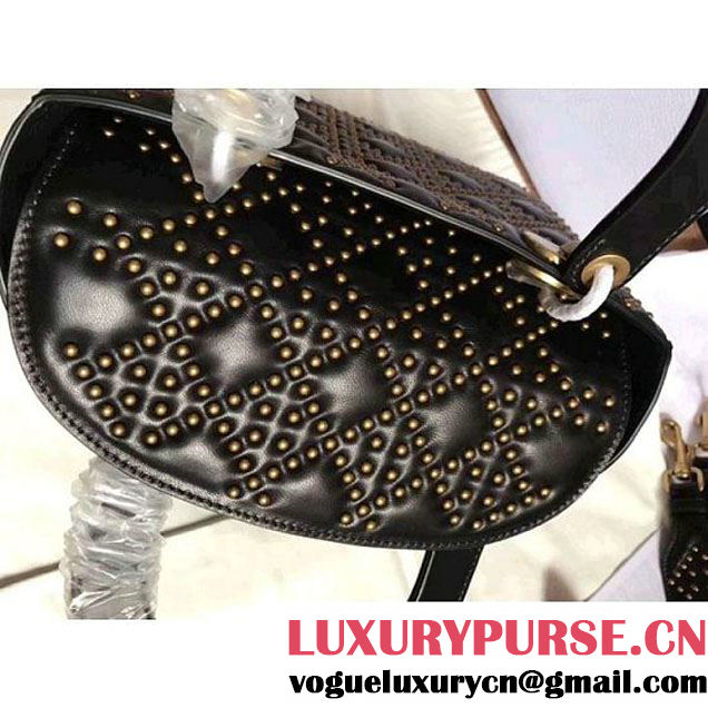 Supple Lady Dior mini bag in black studded "Cannage" design lambskin with wide shoulder strap and aged gold-tone metal jewellery.