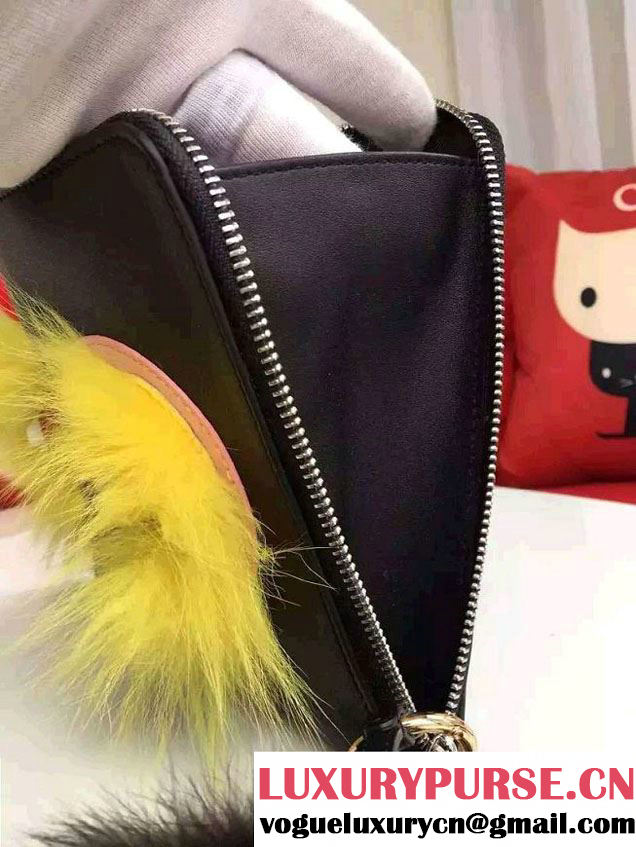 Fendi Inserts and Fox-Fur Monster Flat Clutch Bag Pre-fall 2016 Black calfskin pouch, with florescent yellow leather, elaphe and plexiglass stud appliqués. Zip fastening and gusseted interior. Fendi Roma logo and metal accessories with palladium finish. You may also like