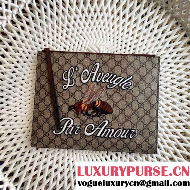 A GG Supreme canvas pouch with embroidered bee appliqué with the embroidered phrase "l鈥檃veugle par amour" which translates to 鈥渂lind for love" on the side.