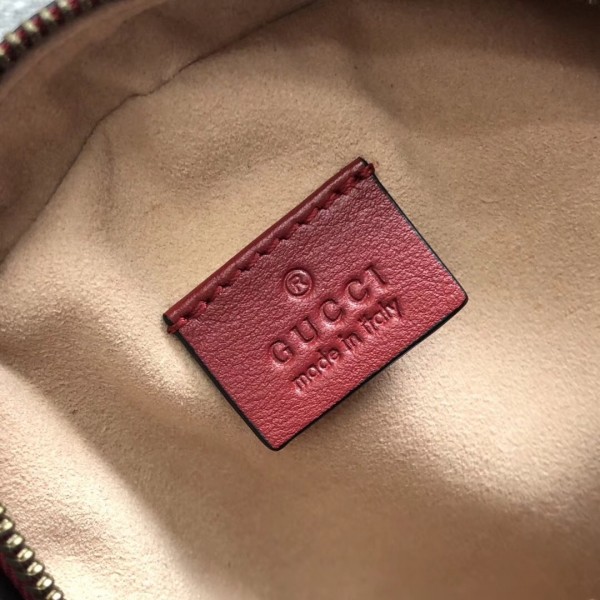 A new introduction to the GG Marmont line for Cruise 2019, the mini bag is presented in a rounded shape with a chain shoulder strap. Defined by the distinctive Double G hardware, made in matelassé chevron leather with a heart on the back, finished with a vintage effect.