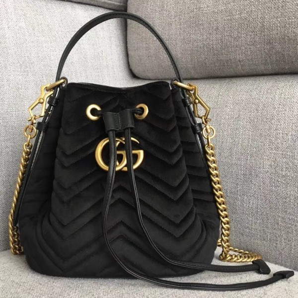 / Gucci GG Marmont Quilted Velvet Bucket Bag 525081 Black 2018 Collection