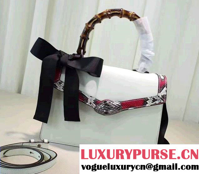 A small leather top handle bag with printed snakeskin detail along the flap and snake head closure. The snake is often associated with the image of Lilith, who in mythology is thought to have been the first wife of Adam and later, a demon. The textured snake head has crystal stones set in the eyes. The bag is further enhanced with a bamboo top handle and black grosgrain bow detail. Made in smooth leather.