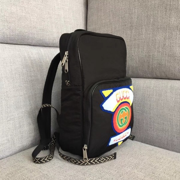 Crafted in black nylon, the techpack is equipped with multiples and decorated with a rainbow terry cloth Gucci patch that is reminiscent of the '80s. The detail brings together two distinctive House codes: the Interlocking G and the emblematic "Loved" motto. Reworked within the Fall Winter 2018 eclectic narrative, the functional backpack is presented in unexpected materials and enriched with new motifs.
