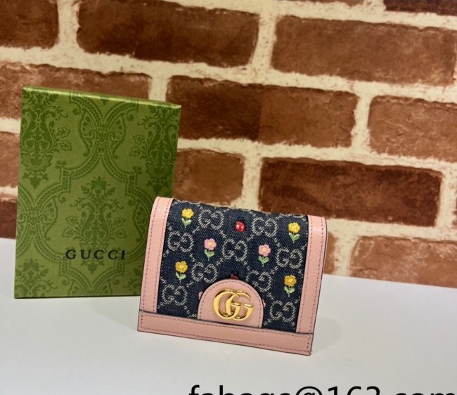Gucci Ophidia GG Denim Card Case Wallet with Floral Embroidery? and Love Motif 523155 Pink/Blue 2022