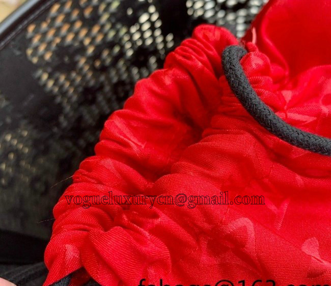 The Monogram pattern is laser cut into the calfskin, producing a delicate cut-out motif through which the interior red textile pouch is visible. It can be carried by hand or on the shoulder.