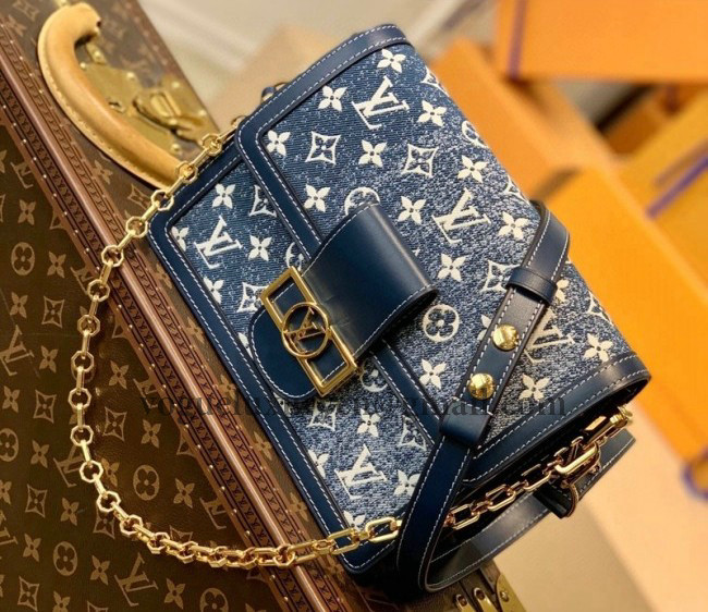 The Dauphine MM handbag, with its vintage lines, is fashioned from faded denim jacquard textile with a Monogram pattern and finished in navy-blue calfskin trim. Sophisticated details like the gold-color LV Circle lock add charm while the removable shoulder strap and two inside compartments bring practicality.