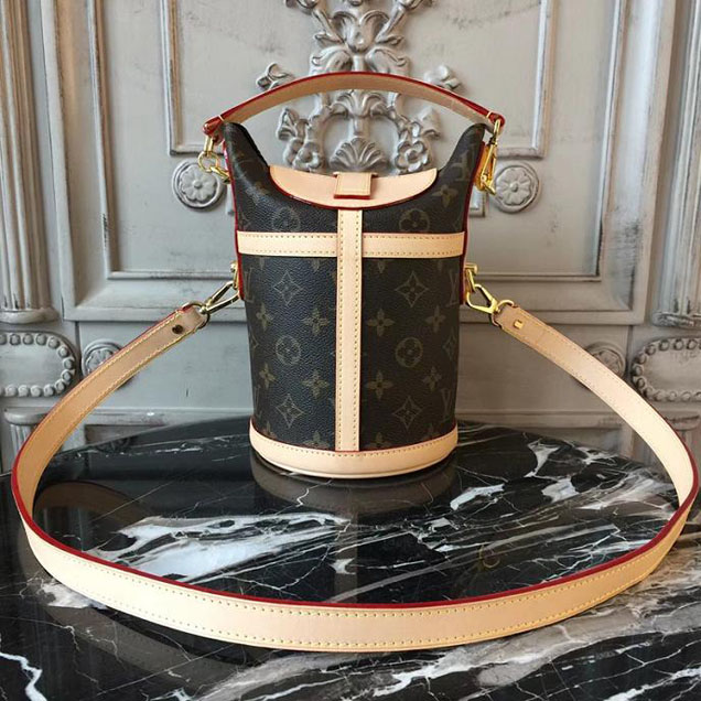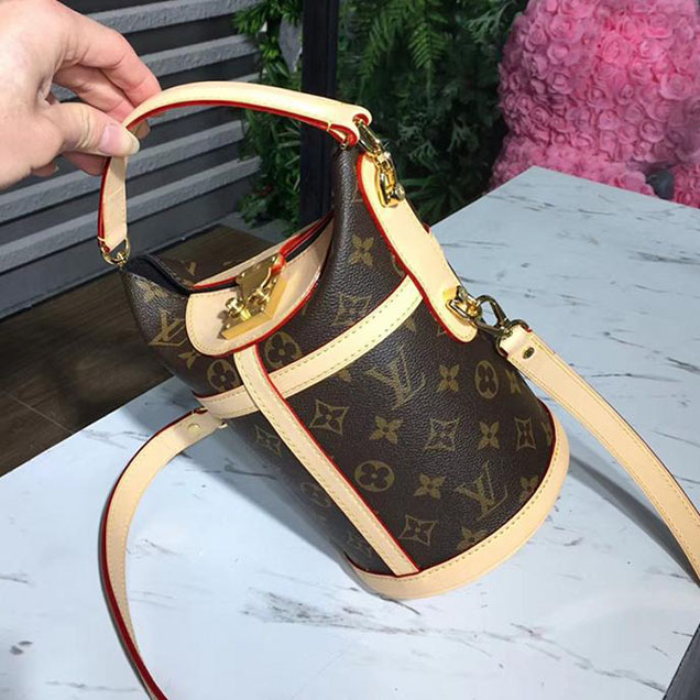 The bucket shape reimagined by Nicolas Ghesquiere as the Duffle tops the list of "it bags" for SS 18. Crafted of supple Monogram canvas with a finely crafted signature S-Lock, it's a stylish option for day-to-dark wear, carried by hand or over the shoulder.