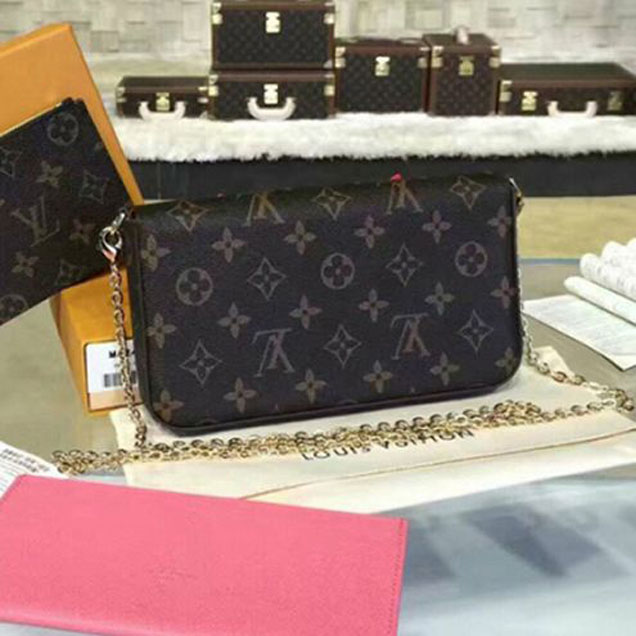 With its two removable interior pockets, the elegant Pochette Felicie in Monogram canvas is the stylish solution to carry and organize your daily essentials. Much more than a wallet, it can be transformed into a glamorous shoulder bag or clutch thanks to its removable golden chain. Composed of Monogram flowers, LV rivets and the golden V signature, the lovely bird character adorning the pouch highlights Louis Vuitton's tradition of craftsmanship.