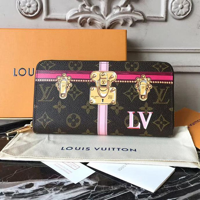 Referencing Louis Vuitton's art of travel, the Zippy wallet in iconic Monogram canvas is embellished with colorful trompe-l'oeil details inspired by the historic trunks. This ingenious design includes an array of pockets and compartments within a secure, zip-around format. This collectible edition belongs to the Trunk Summer 2018 theme taking in accessories and leather goods.