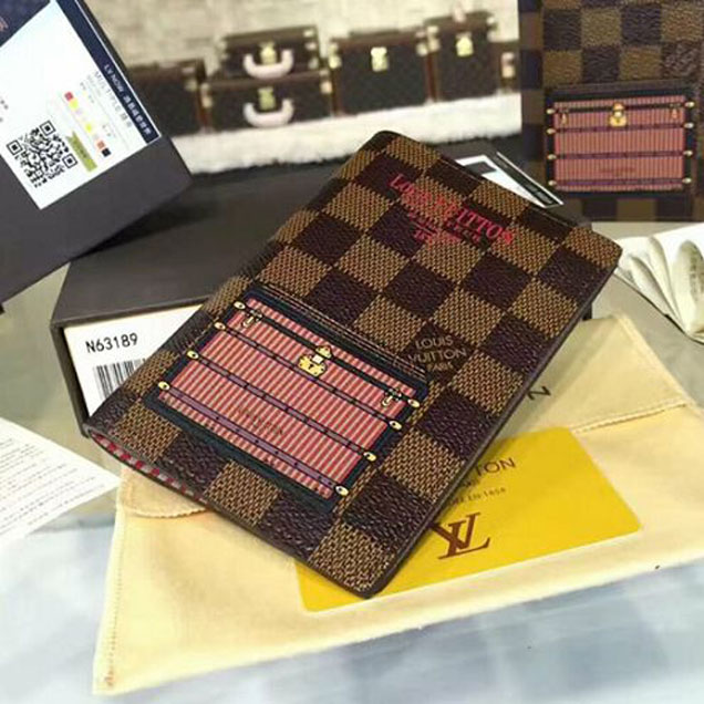 This passport holder in Damier canvas features various compartments to hold business cards and papers.