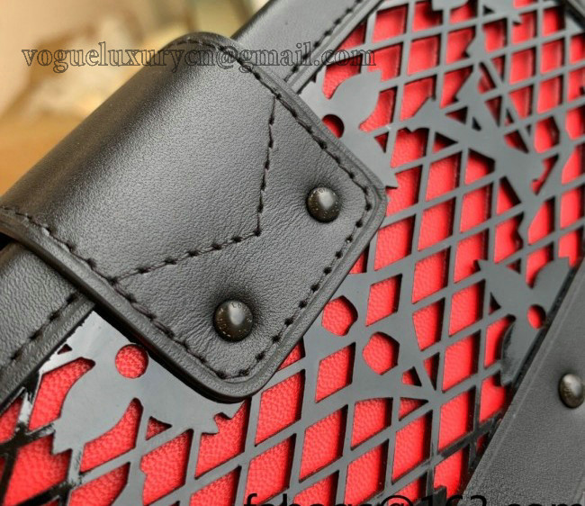 At first glance this Petite Malle handbag seems to be made from openwork lace but on closer inspection it reveals itself to be patent calfskin with a perforated Monogram pattern.