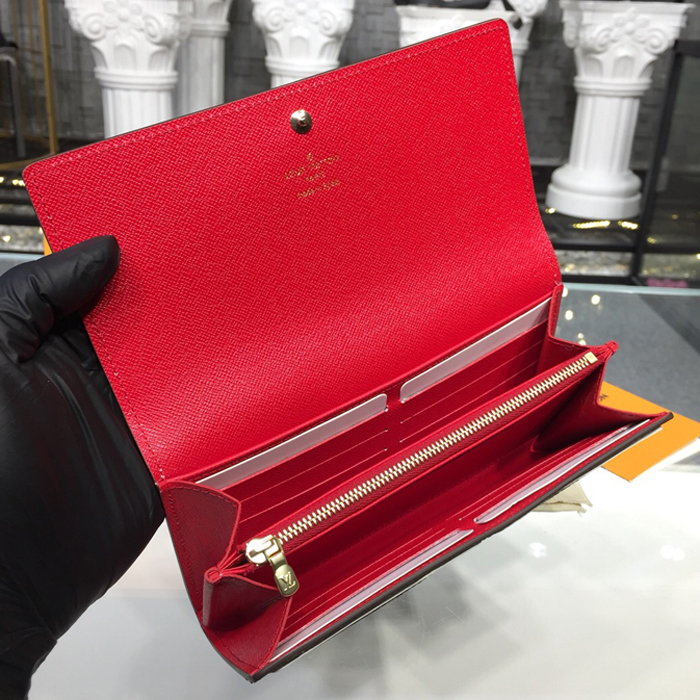 Size: L 7.5 x H 4.1 x W 1.0 inches / 19 x 10.5 x 2 cm Monogram coated canvas Cowhide-leather lining Gold-color hardware 16 credit card slots Zipped coin pocket 2 large gusseted compartments 2 flat inside pockets Exterior back pocket Press-stud closing
