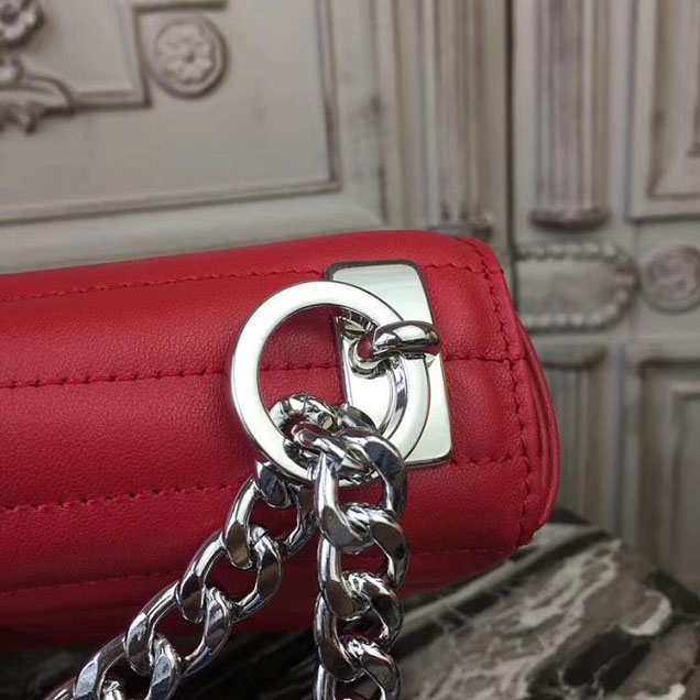 Flat shoulder strap with curb chain trim. Flap top with magnetic closure. Metal logo lettering on flap. Interior; one zip and one slip pocket Made in Italy Size: 25cm x 17cm x 6cm You may also like