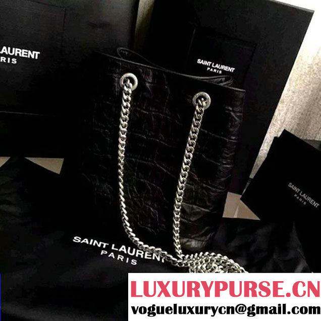 SAINT LAURENT CLASSIC BABY EMMANUELLE CHAIN BUCKET BAG IN BLACK CROCODILE EMBOSSED LEATHER