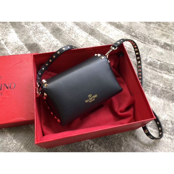 Valentino Calfskin Crinkly Garavani Rosso Rockstud Cross Body Bag Black 2017